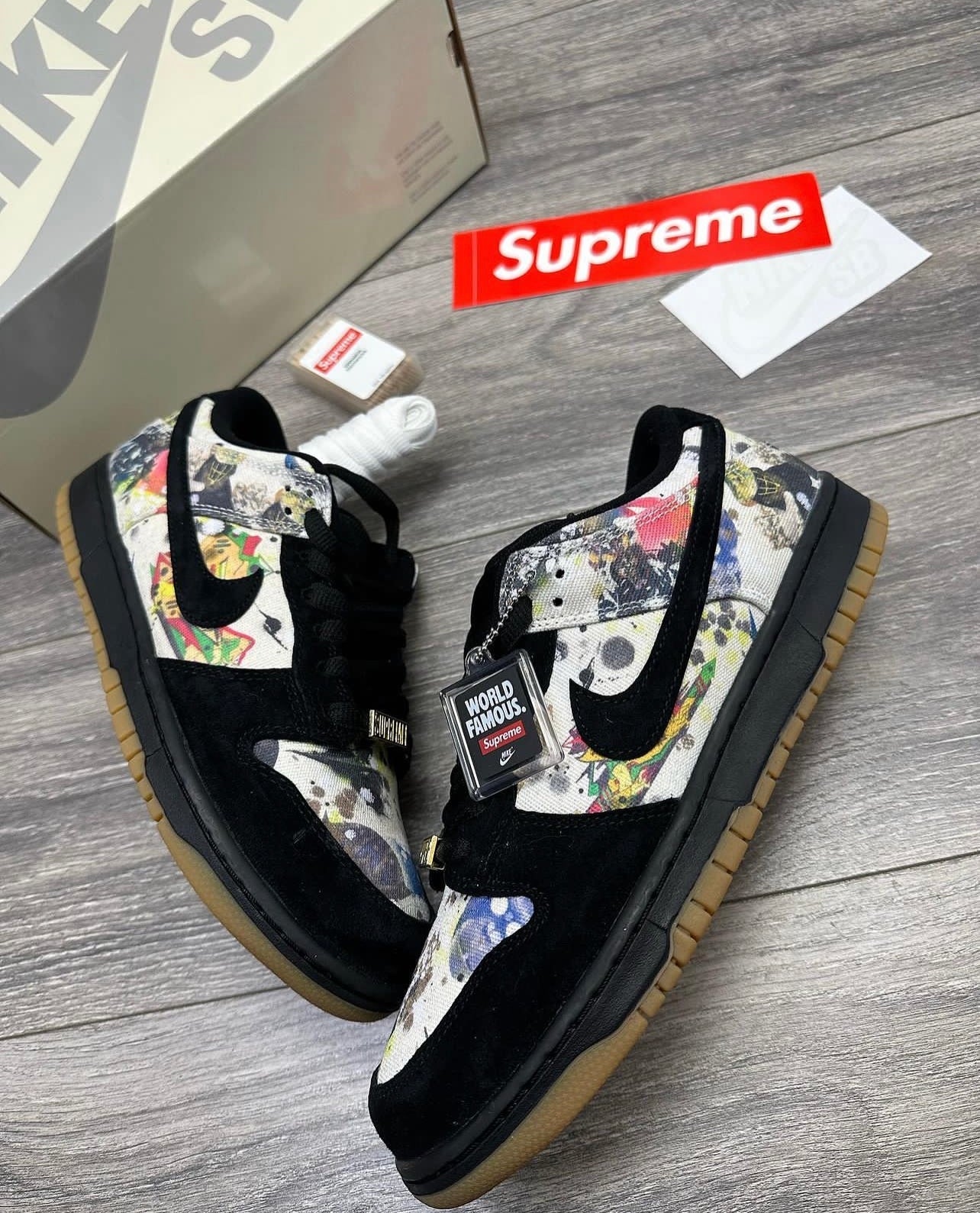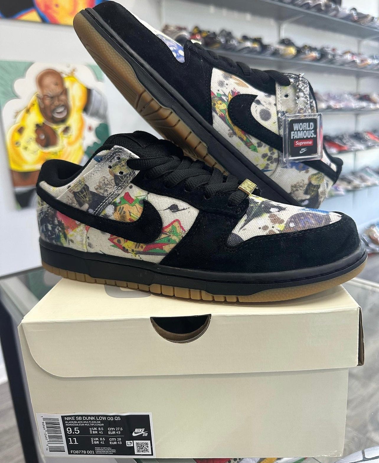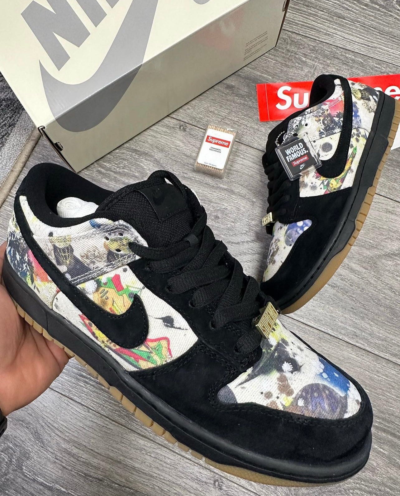 The Supreme x Nike Dunk Low SB 'Rammellzee' brings together the late artist, who was known for his multimedia sculptures and graffiti with the renowned NYC skate brand. The Dunk Low silhouette is highlighted and adorned with Rammellzee's original designs on a canvas upper. The eyestay, Swoosh, and forefoot overlay are constructed from durable black suede that is repeated on the textile collar lining and the padded mesh tongue. The shoe is accented with metallic gold 'Supreme' lace dubrae, while a durable cupsole with black sidewalls and a gum rubber outsole supplies optimal support and grip underfoot.