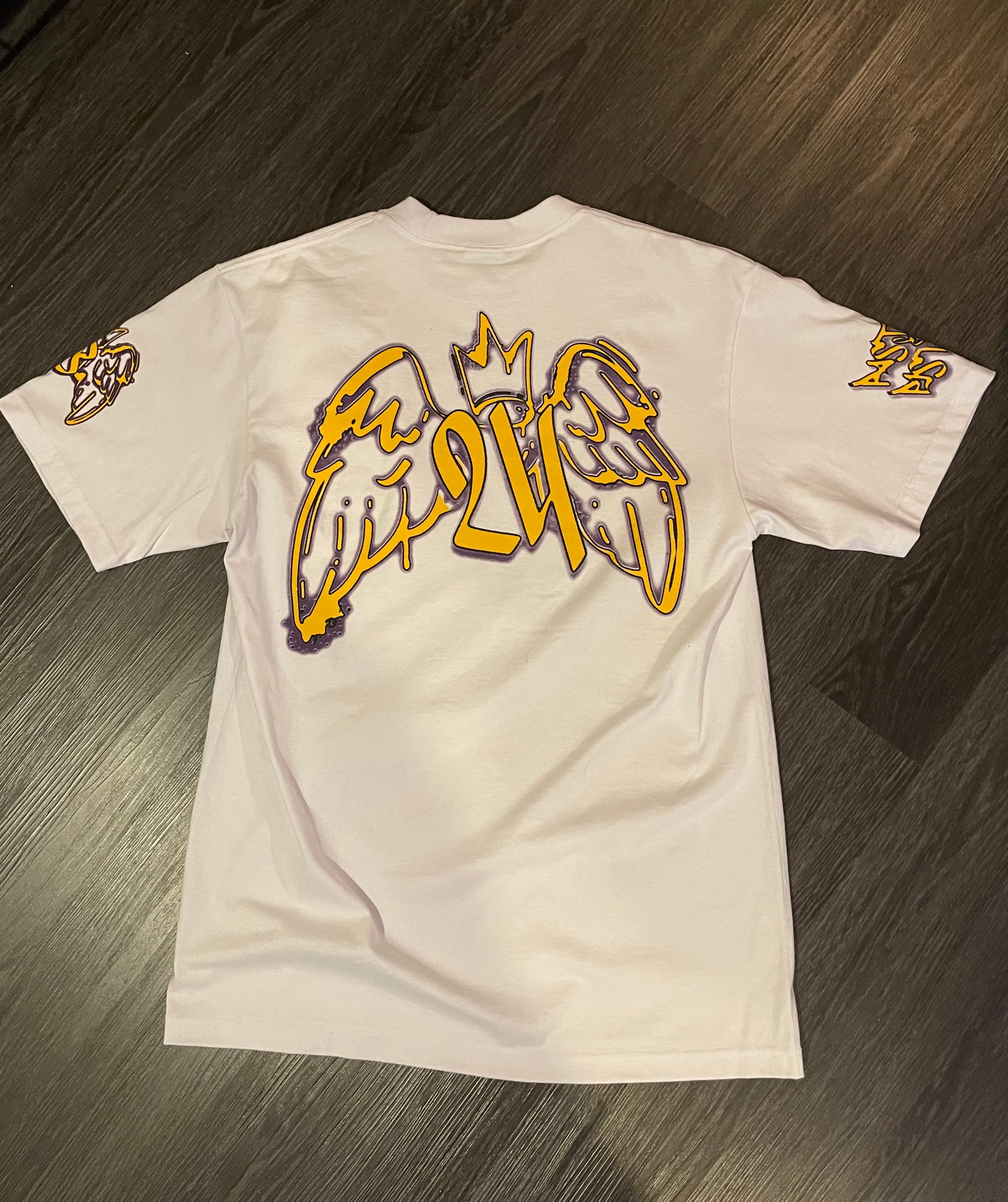 We’re beyond excited to unveil the Mamba Angel Tee, a tribute to the legendary Kobe Bryant, mastered by the Cotton Sniper. This 250 GSM hand-cut T-shirt, featuring vibrant purple and gold graffiti designs